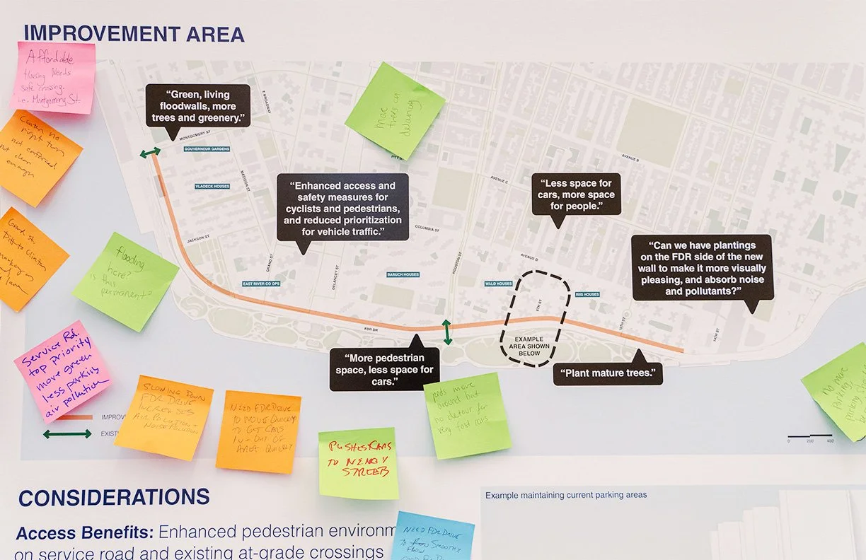 In 2023, NYC DOT completed the East Village / Lower East Side Waterfront Access Study which studied the feasiblity of improvements along the FDR corridor from Montgomery St to 14th St. As urban designers, the team studied possible configurations for additional green space and planting along the corridor. As community engagement lead, the team synthesized the complex existing conditions, such as the layers of intermingled utilities, planned construction limitations, and future flood conditions, to convey the feasiblity of potential design outcomes. The team used a variety of engagement techniques, such as in-person workshops, open houses, tabling at community campuses, digital surveys, and virtual meetings. See the full report here.